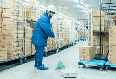 倉庫に商品を入庫します。倉庫整理の際には、専用端末を用いて、発注データとの照合、賞味期限(入荷期限)、数量をチェックしながらパレット・フォークリフトやコンビテナーなど、適切な物流機器を用いて、ロケーションごとに収納していきます。